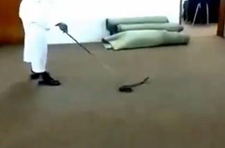 كشف مقطع فيديو تم نشره على موقع "يوتيوب"مواطن يتحدي ثعباناً، في إحدى الصالات داخل دائرة حكومية بمنطقة جازان.