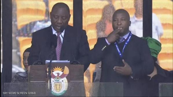 جنوب إفريقيا إن الرجل الذي قدم لغة الإشارة من على منصة حفل تأبين نيلسون