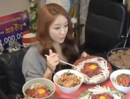 الطعام والقيام بأكله أمام عدسة كاميرا الكمبيوتر الخاص بها في بث مباشر