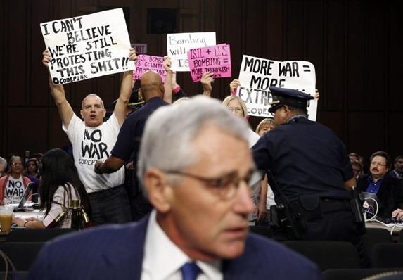 لافتات مناهضة للحرب، أثناء إدلاء وزير الدفاع الأمريكي "تشاك هاجل" يوم 16