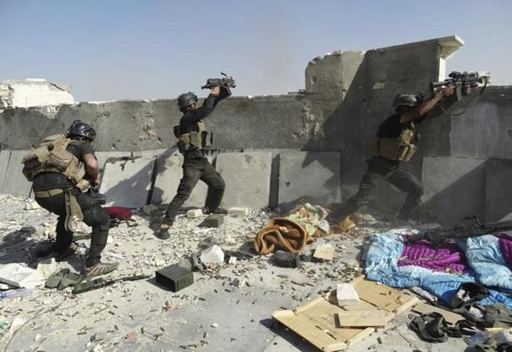 أعضاء قوات العمليات الخاصة العراقية، يتخذون مواقعهم خلال اشتباكات مع تنظيم الدولة الإسلامية في مدينة الرمادي، يوم 19 يونيو.
