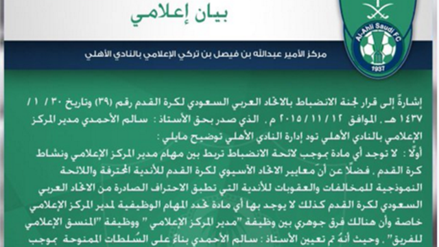 اصدرت إدارة النادي الأهلي بيان رسمي امس ذكرت فيه حول قرار لجنة الإنضباط فيما يخص مديرالمركزالإعلامي اكد ت فيه أن سالم الأحمدي مدير المركز